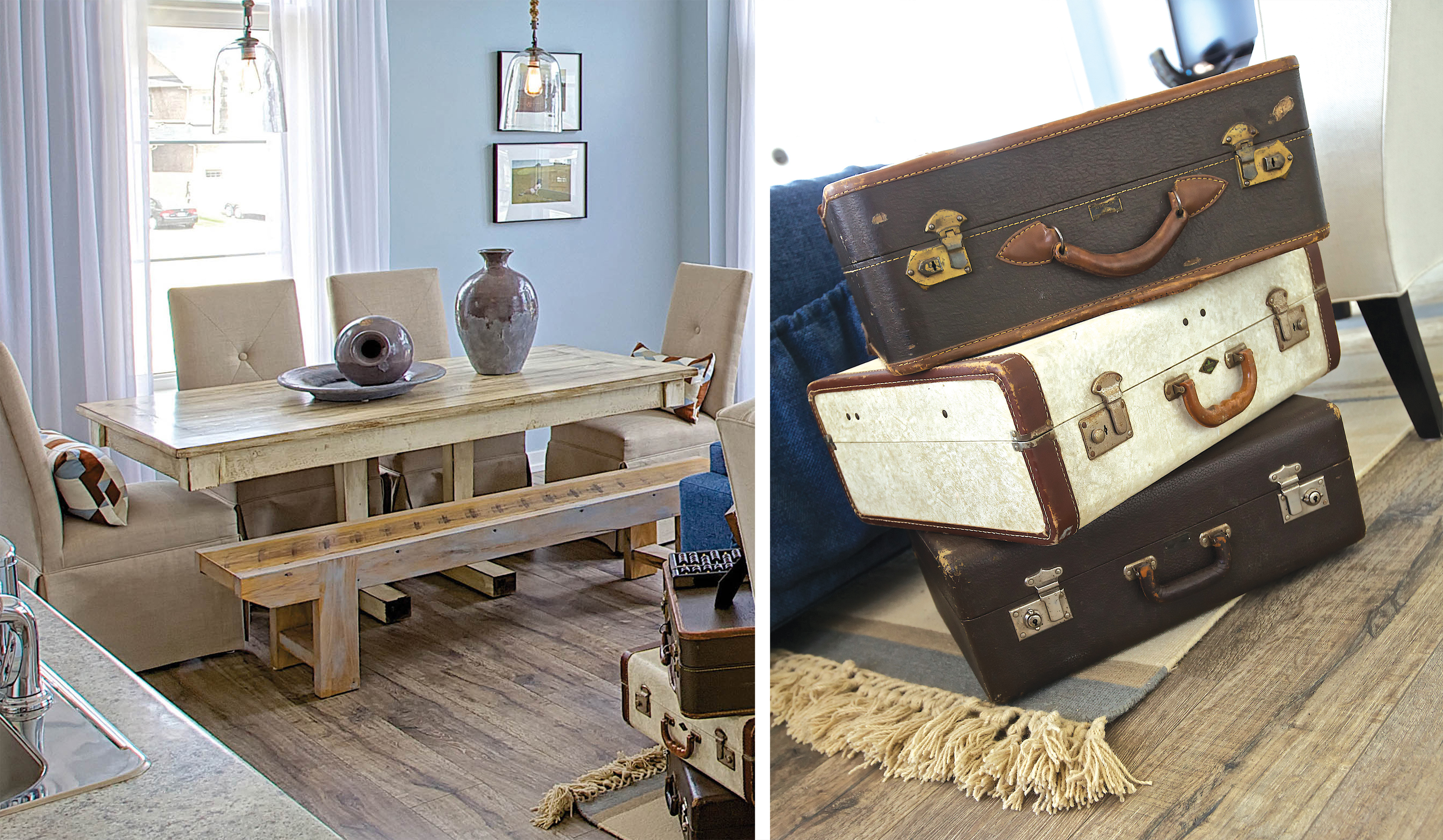 Old farm tables and repurposing vintage suitcases offer a retro feel.
