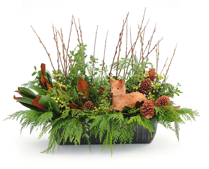 It’s not all glitz and glam though. There’s also a return to rustic, natural woodland accents, especially in outdoor container design. Look for driftwood stars, birch lollipops and straw owls and reindeer.