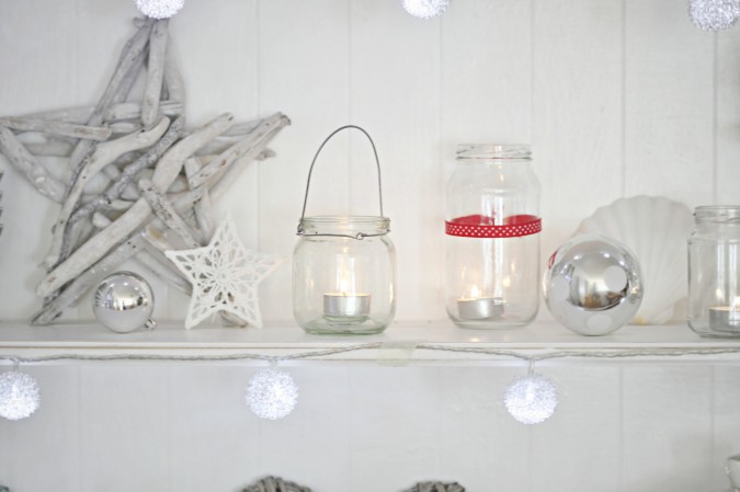 Let your holiday decor reflect your own personality. Using driftwood stars was only the start of this coastal inspired theme. I found this on a beach cottage blog and was determined to try the tealights in the clear glass jars.