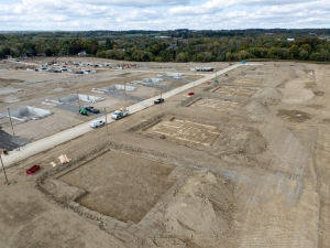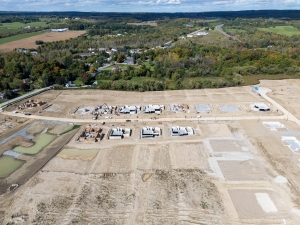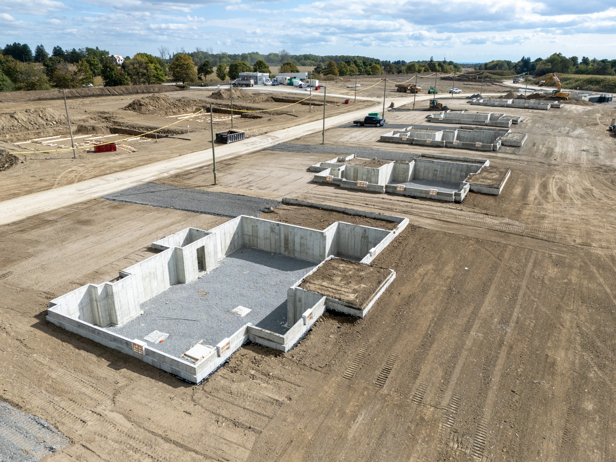 Home construction is well underway, with 39 lots at various stages. The firebreak lots had their foundations poured, backfilled, and the first floors capped in preparation for future development.