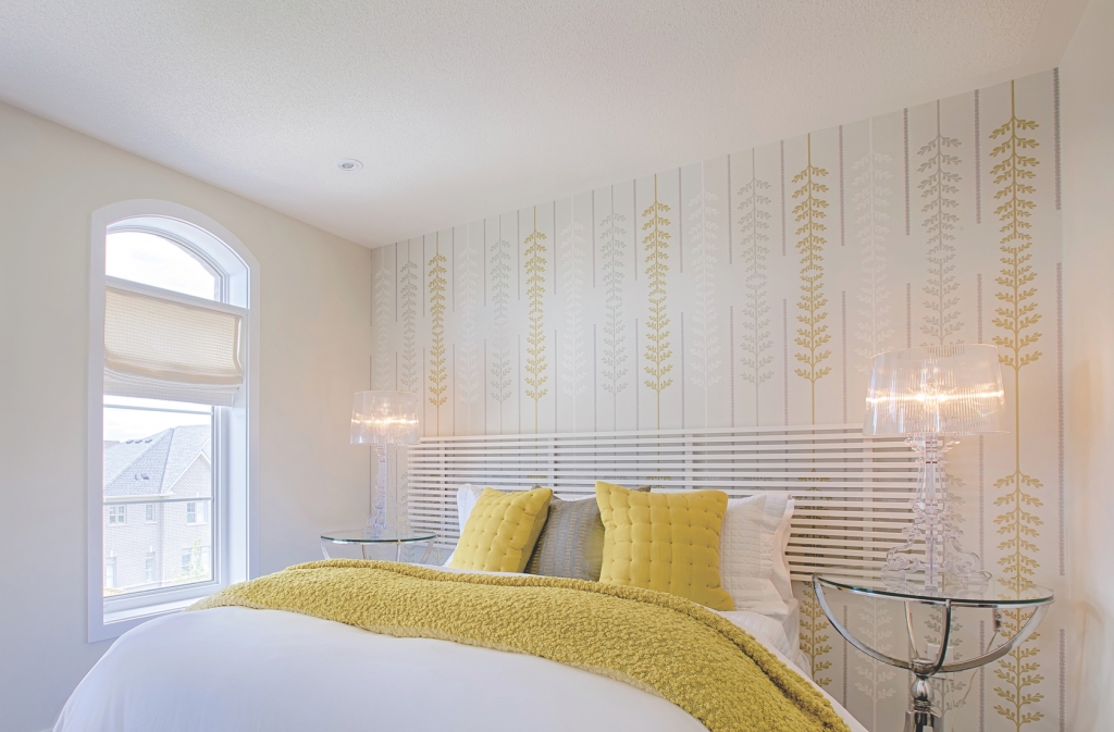 This bedroom at Geranium’s Uptownes at Cardinal Point showcases a wallpaper treatment that complements the room’s design.