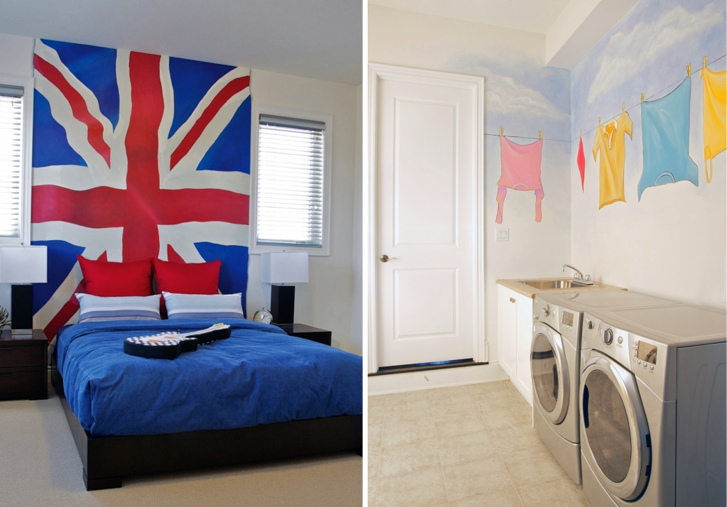 The Union Jack flag serves as the focal point in this Britannia-themed guest bedroom, while the painted clothesline adds a touch of whimsy to this laundry room from Geranium’s Forest Trail Estates