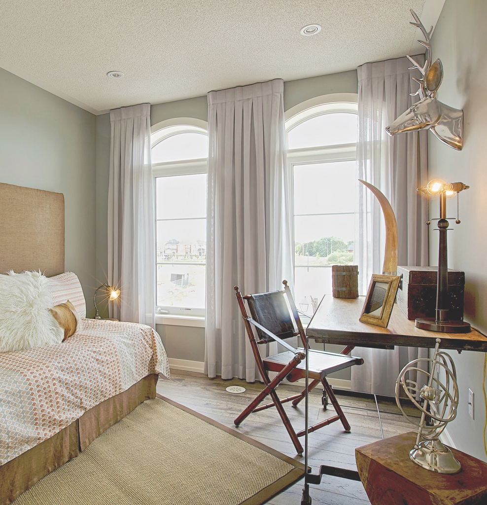 The silver faux deer head adds an unexpected fun touch to this guest bedroom that doubles as a home office at Uptownes.
