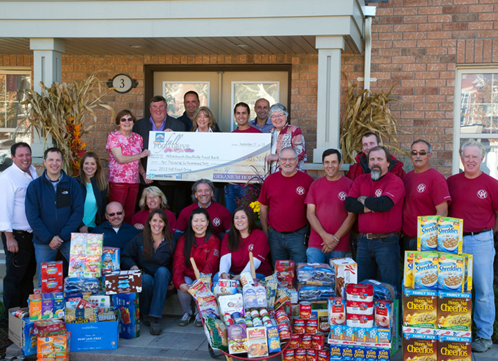 Every year Geranium Homes aims a little higher in their goal for collecting food and donations to support the Whitchurch-Stouffville Food Bank and they’re never disappointed. They started in 2009 with many truckloads of non-perishable food items and a cheque presentation of $2,450. This year Geranium’s President Boaz Feiner presented a cheque in the amount of $10,630! This represents the combined total of funds from Geranium’s donation of $50 per home sold at Cardinal Point in the past year as well as contributions including $2,000 from James Hardie Building Products.
