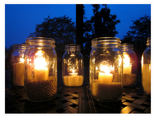 Put a tea light or candle, or even a glow stick, in the jar and light. Not only is this easy, but it looks fantastic and adds charm to a warm outdoor evening. Add some sand, pebbles, epsom salts, in the winter, even snow – to enhance the effect.