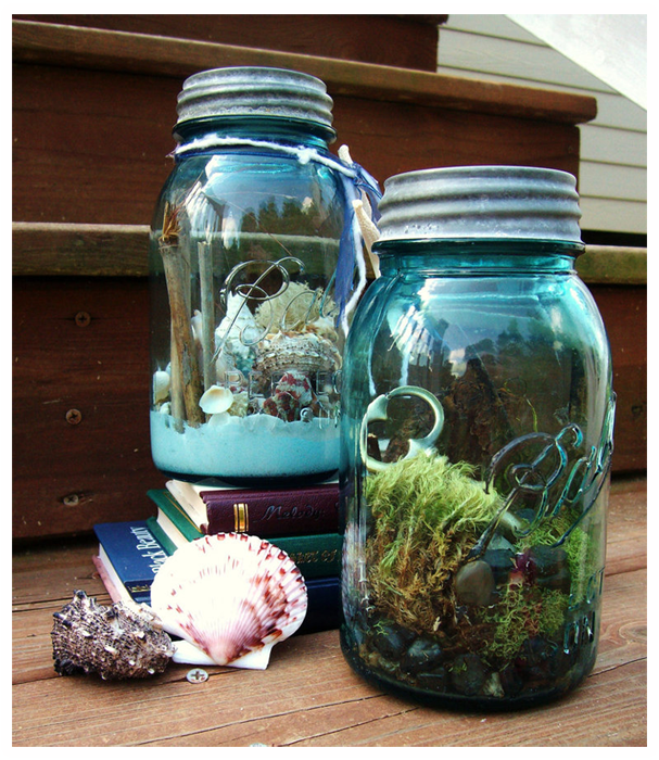 But why buy knock offs when you can create your own neat crafts? After my enthusiastic attempt at canning last summer, I now have a shelf full of the coveted mason jar, just waiting to be “repurposed.” So I thought I’d look at some of the more interesting ideas for transforming those jars… other than canning.