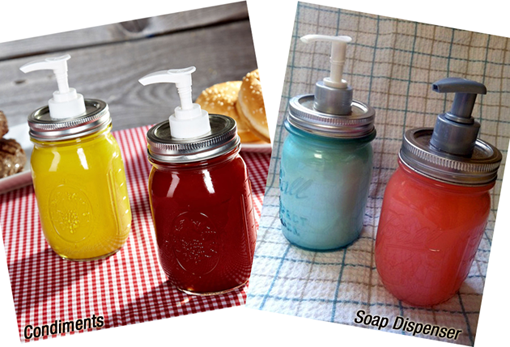 Whether it’s mustard and ketchup for the BBQ or soap for the bathroom, this is an easy DIY project. Just take a plastic dispenser from a soap bottle you already have, (or get one at the dollar store) and insert it into the hole in the lid. You may need to use a little bit of hot glue to hold into place. Clean, fill and use!