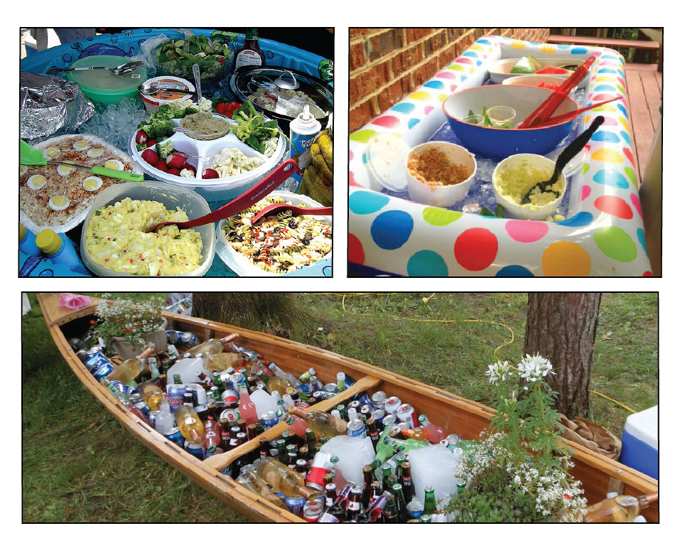 So many creative ideas for keeping food and beverages cold, using a pool raft, a kiddy pool, (thanks to Beauty & Bedlam for those two suggestions.) Just about anything will work that holds ice, and it adds a fun, festive mood to the party. This summer I went to a wonderful outdoor wedding where they used a canoe to keep the drinks cold.
