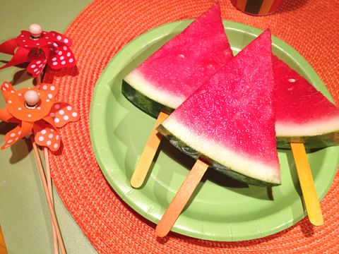 Summer just isn’t summer without Watermelon! But it’s often too messy to serve at a party. Next time cut watermelon into triangular slices and insert popsicle/craft sticks (available at any dollar store) through the rind – and serve like Popsicles!