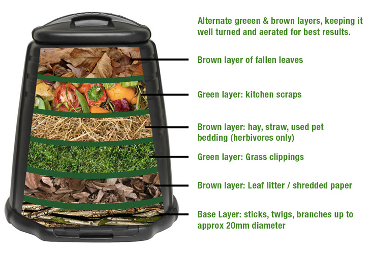 The next step to good composting is choosing the best location. Find an easily-accessible spot with good drainage, and be sure to place it on bare ground. Choose a spot that’s out of full sun, but not in full shade either. Too much sun results in excessive heat build-up while full shade will cool the bin too much. Both situations will result in compost that lacks sufficient nutrients for growth. If possible, position the bin right in your garden, as long as it’s still accessible enough to easily add your food waste to regularly.