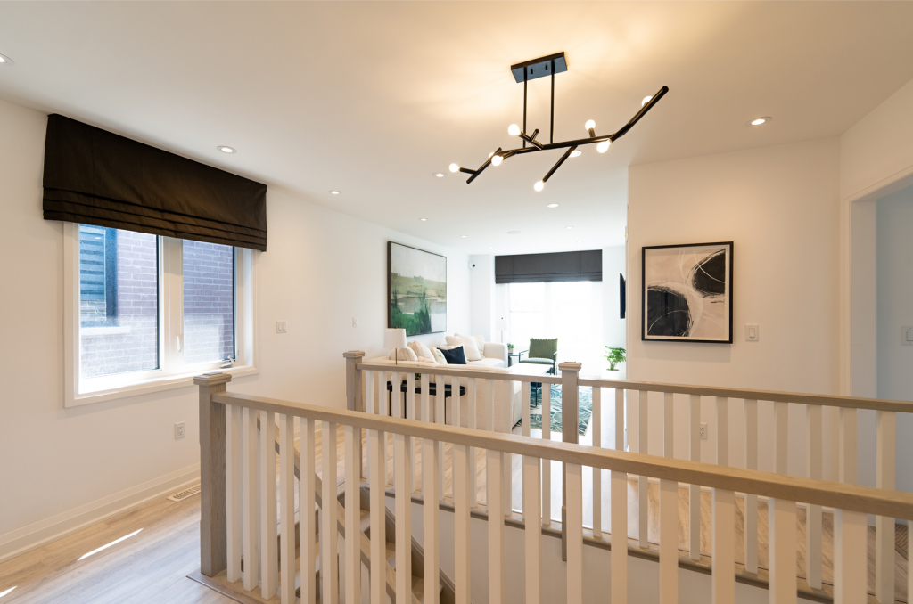 Pot lights are a great choice for hallways, family rooms, kitchens, and anywhere you’re looking for an even distribution of light. “In this hallway in our Hemlock model, the fixture hangs down from the ceiling for interest, however not too far to obstruct views,” Jo-Ann points out, “natural light floods in through the large windows.”