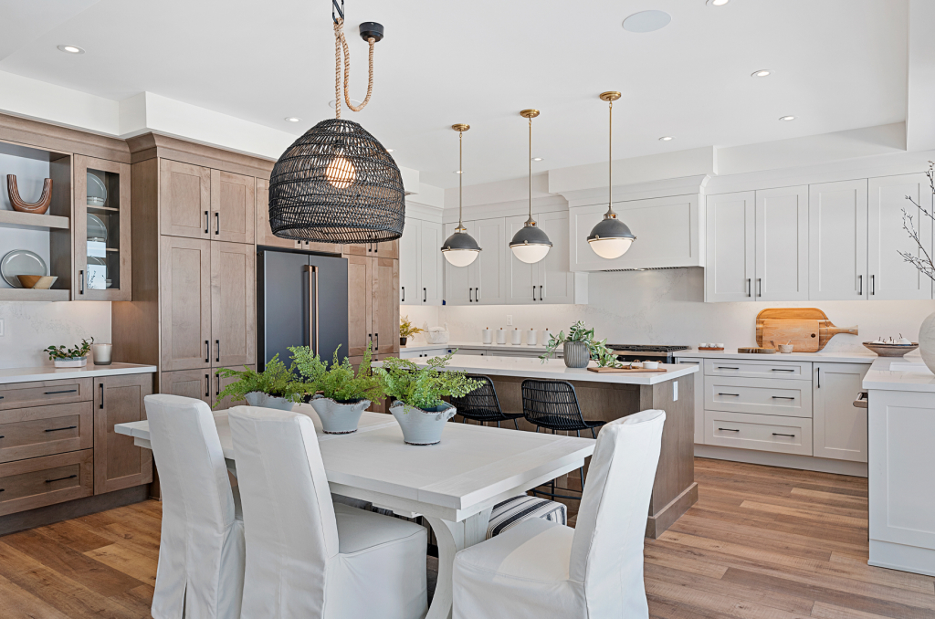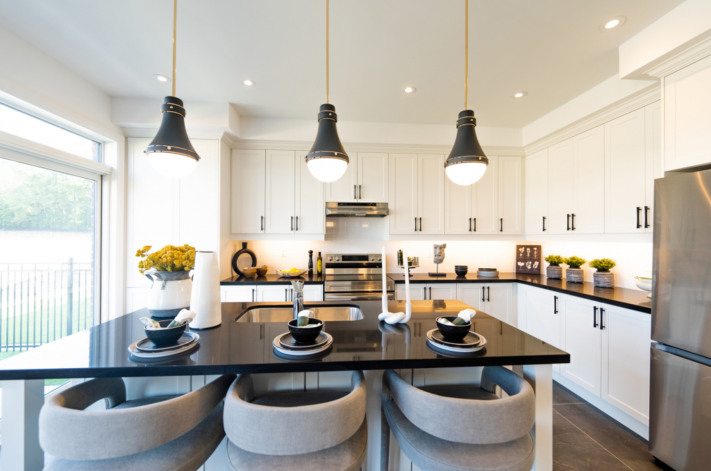 The kitchen area should be well lit and have dimmers for adjusting light levels based on tasks or ambiance needed. “In the Hemlock model at Midhurst Valley, pot lights provide general lighting, valance lights serve as task lighting, while pendants provide the accent necessary for above the island,” explains Jo-Ann. Under-cupboard lighting is another form of task lighting in a kitchen, providing much-needed illumination to essential food prep areas.