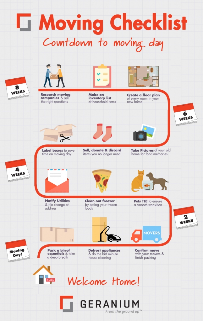 Moving Tips Congratulations on the purchase of your new home!  You’re ready to start a new chapter in your life!  Moving to a new home is so exciting – a chance to declutter and start fresh. At Geranium Homes, we’ve had the opportunity to share in the joy of moving into a new home with more than 8000 families.  And we’re pleased to share a simple checklist of useful tips that will help make moving a smoother transition.