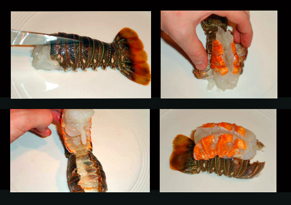 • Cut the shell down the center all the way to the tail leaving tail fan intact.(Don’t remove the under shell.