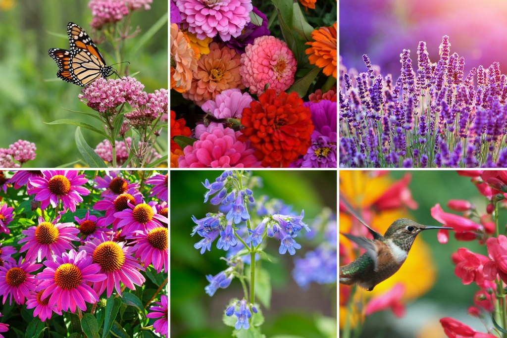 Top LTR: Milkweed, Zinnia, Lavender Bottom: Coneflower, Foxglove Beardtongue, Trumpet Vine