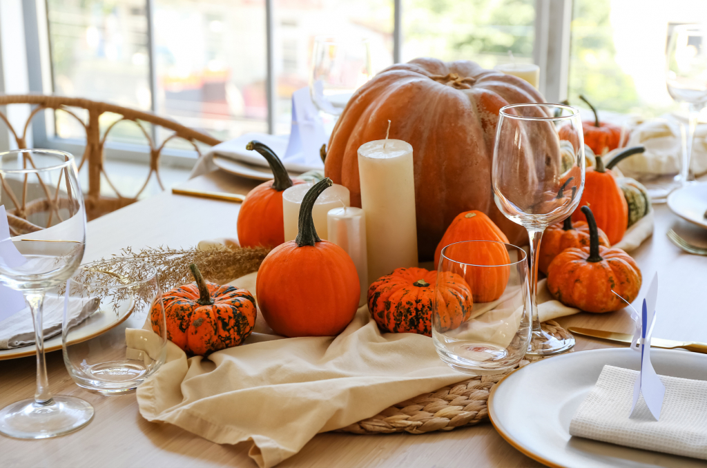 Remember the game plan – keep it simple. A pretty tablecloth, some handmade name cards, candles and a DIY centrepiece, and you’re ready. Use pumpkins, flowers from your garden, or things around the house for a simple, festive look.
