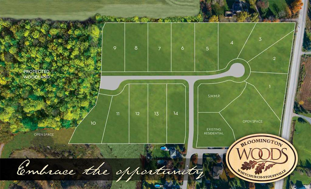 Backing onto natural woodland, Bloomington Woods presents a one-of-a-kind home buying opportunity. This is an exclusive double enclave community that features just 14 ¾ acre country lots in wonderfully rural setting.