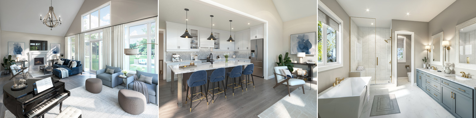 - Washerless single lever water efficient faucets in all secondary bathroom vanities with pop-up drains, except for primary ensuite and powder room.**